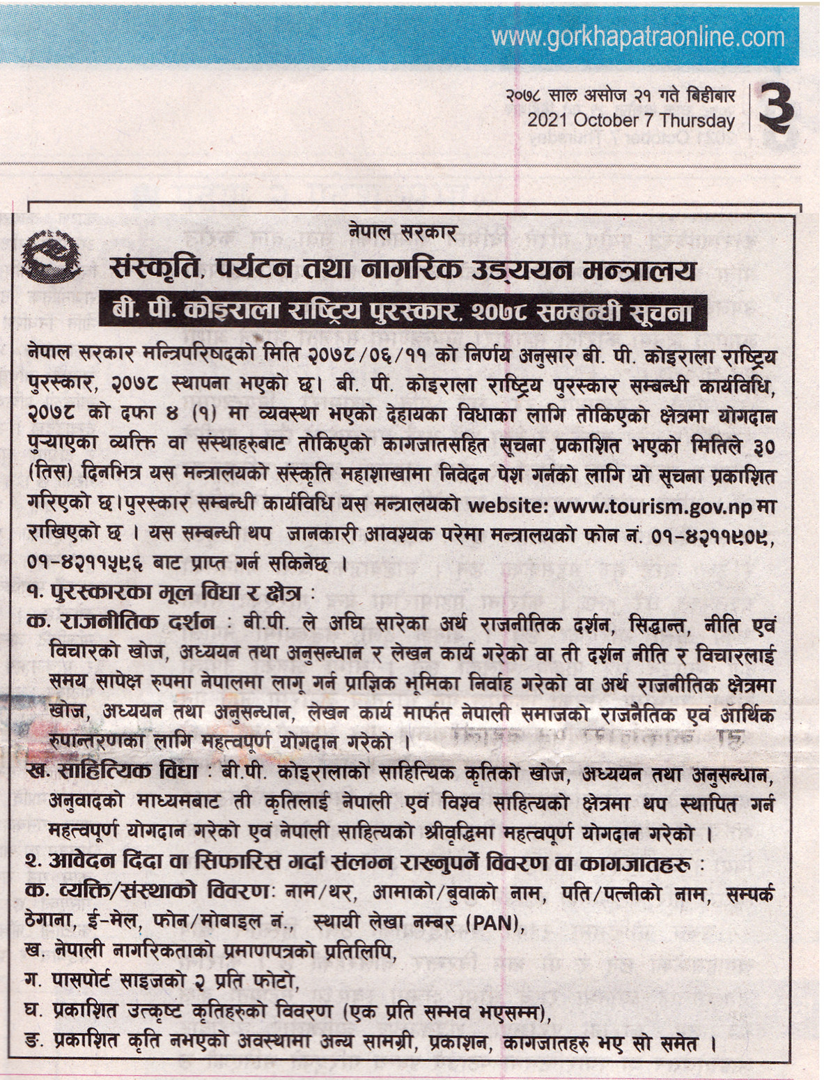 बी.पी. कोइराला राष्ट्रिय पुरस्कार २०७८ सम्बन्धी सूचना । |