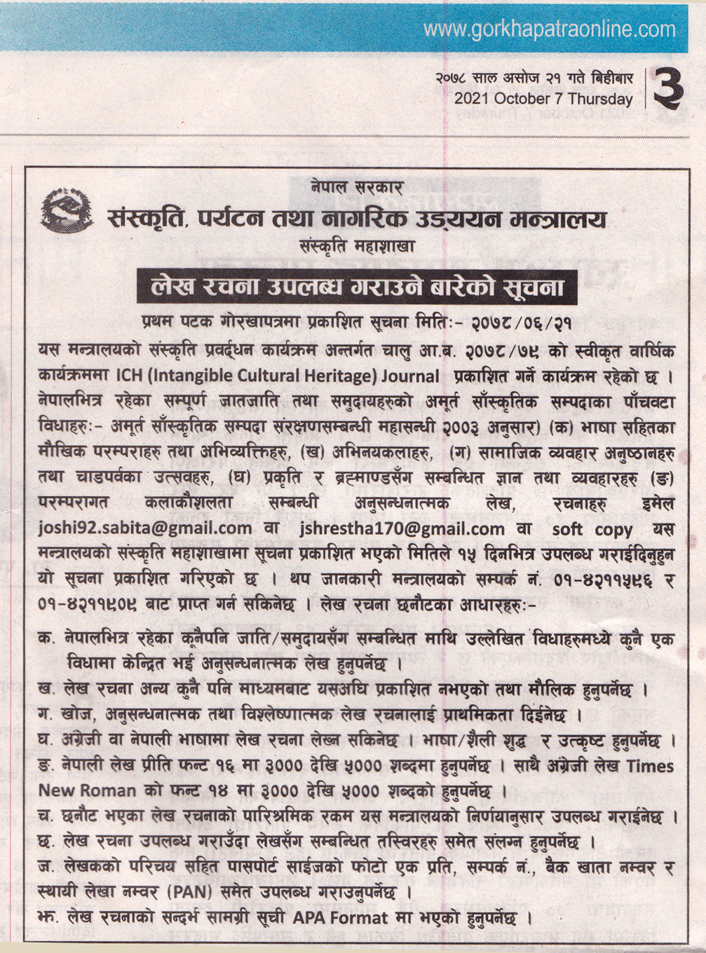 लेख रचना उपलब्ध गराउने सम्बन्धी सूचना । |