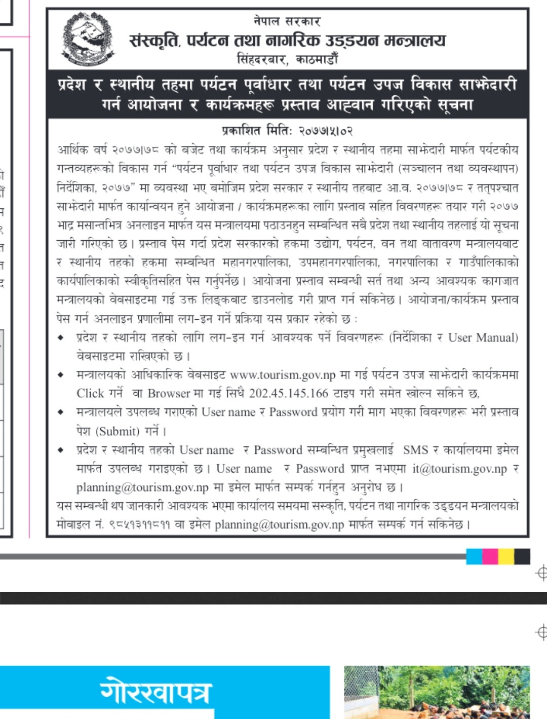 प्रदेश र स्थानीय तहमा पर्यटन पूर्वाधार तथा पर्यटन उपज विकास साझेदारी गर्न आयोजना / कार्यक्रमहरु प्रस्ताव आव्हान गरिएको सूचना मिति २०७७/५/०२