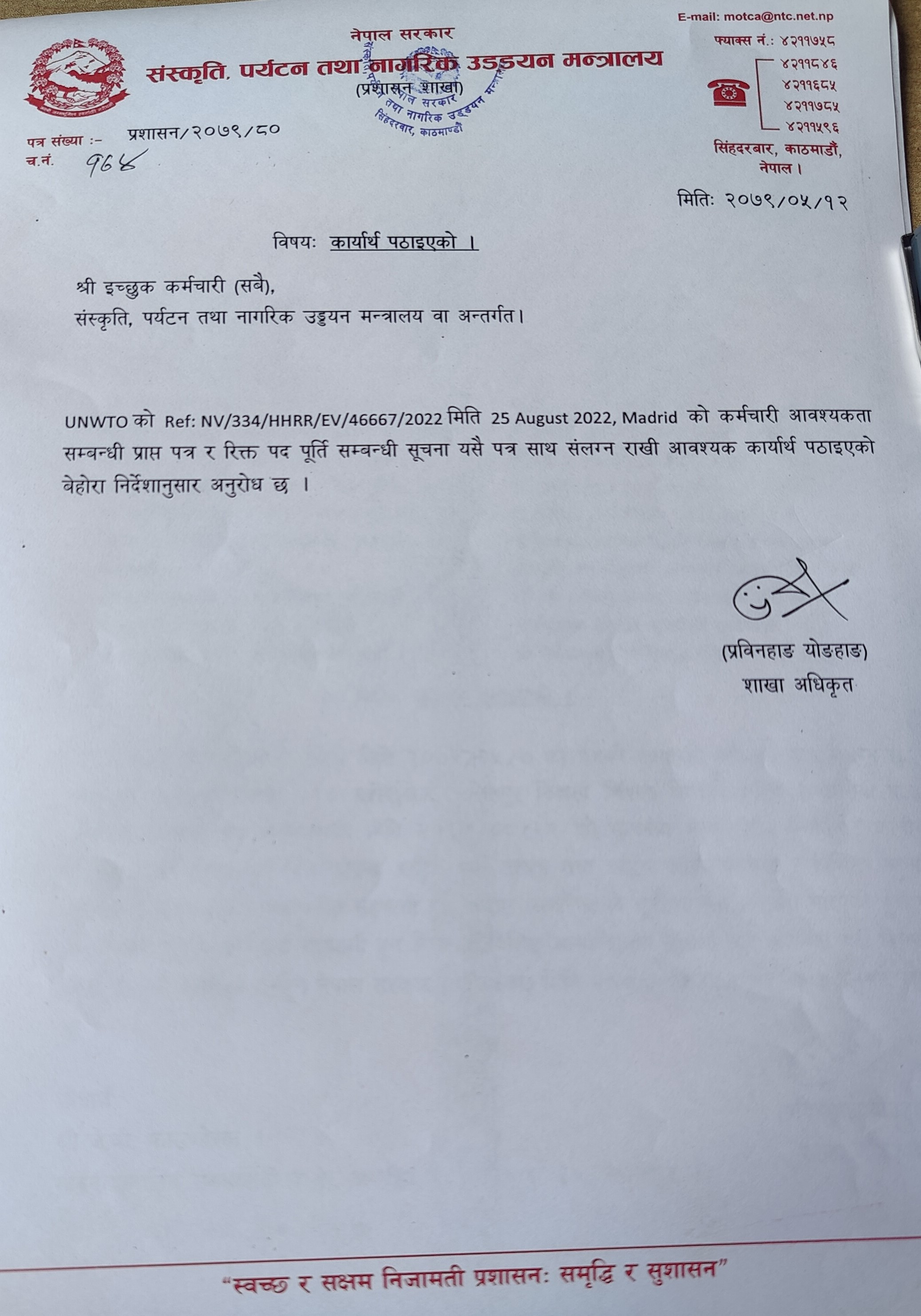 इक्छुक कर्मचारी सबैमा:- कार्यार्थको सम्बन्धमा UNWTO Regional Office : Vacancy Announcement