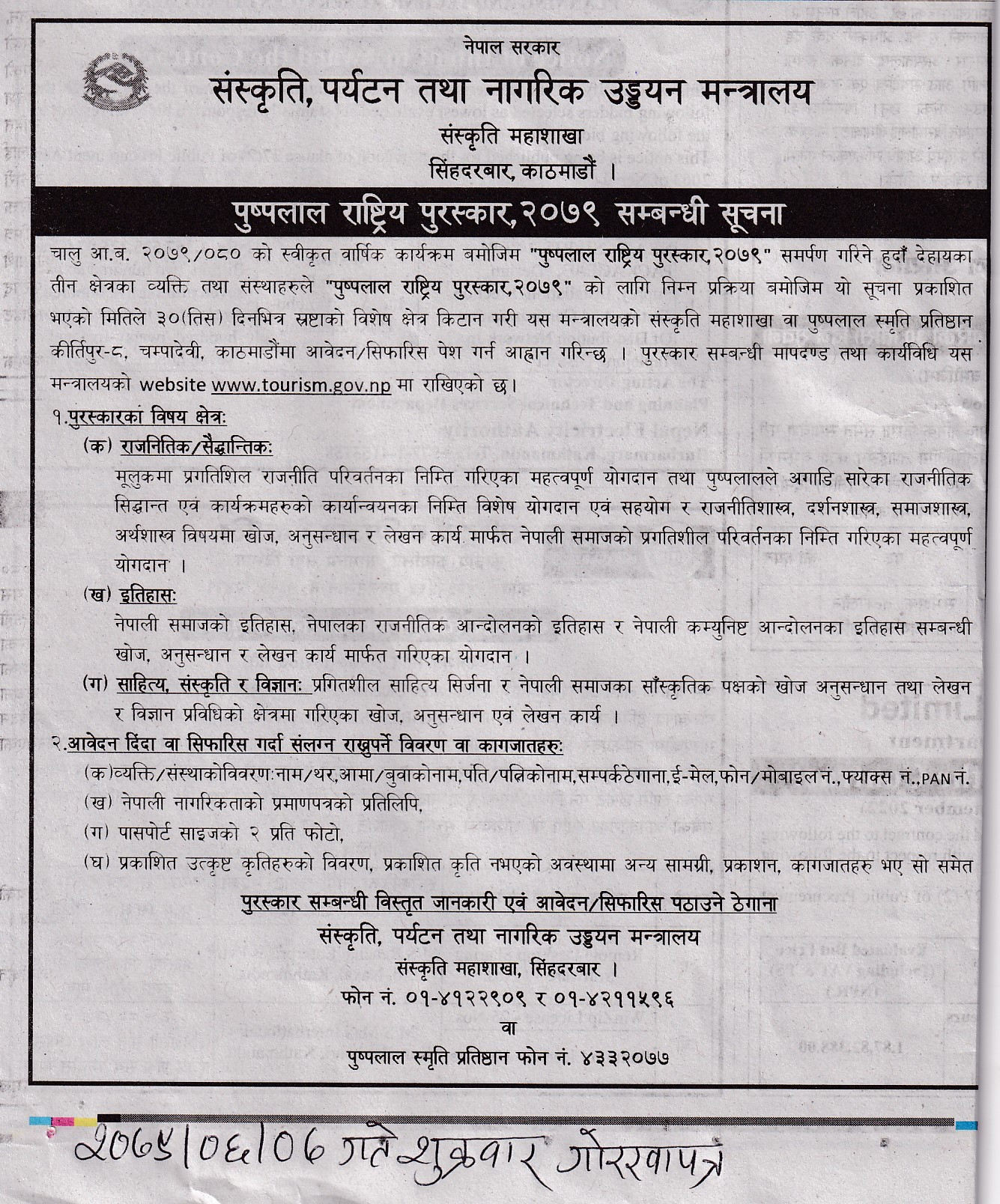 पुष्पलाल राष्ट्रिय पुरस्कार, २०७९ सम्बन्धी सूचना