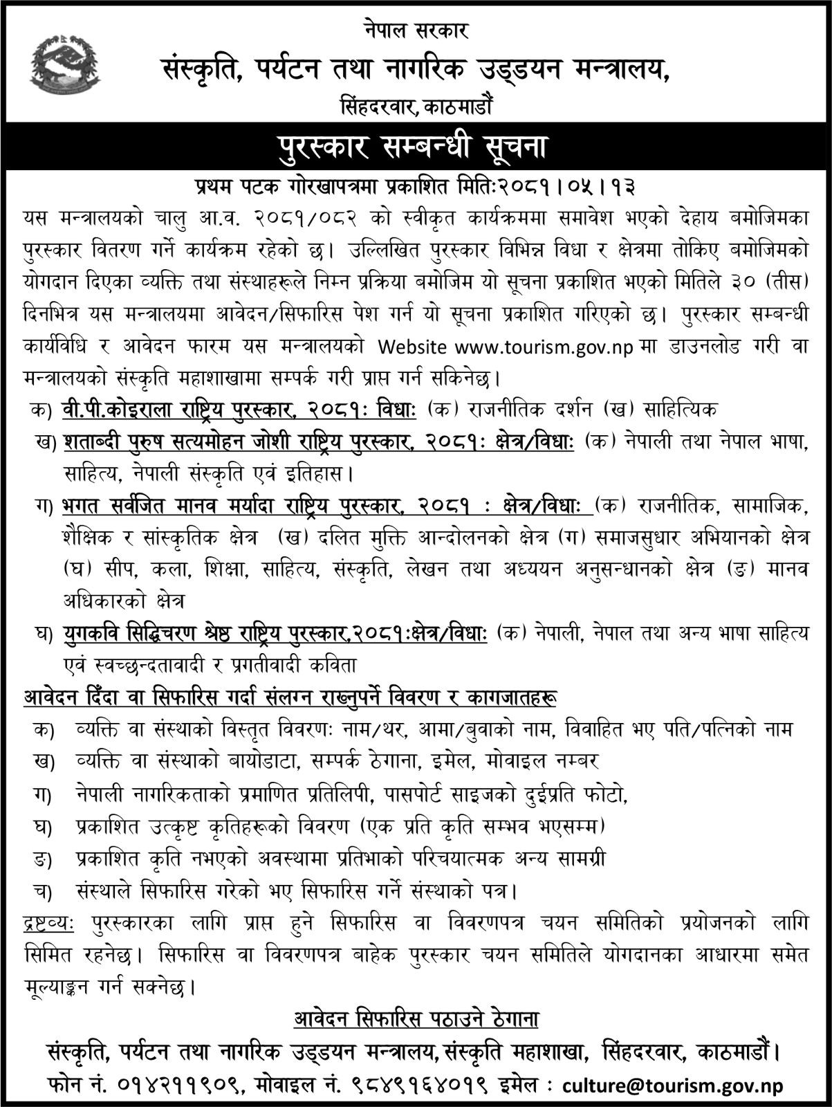 पुरस्कार सम्बन्धी सूचना !