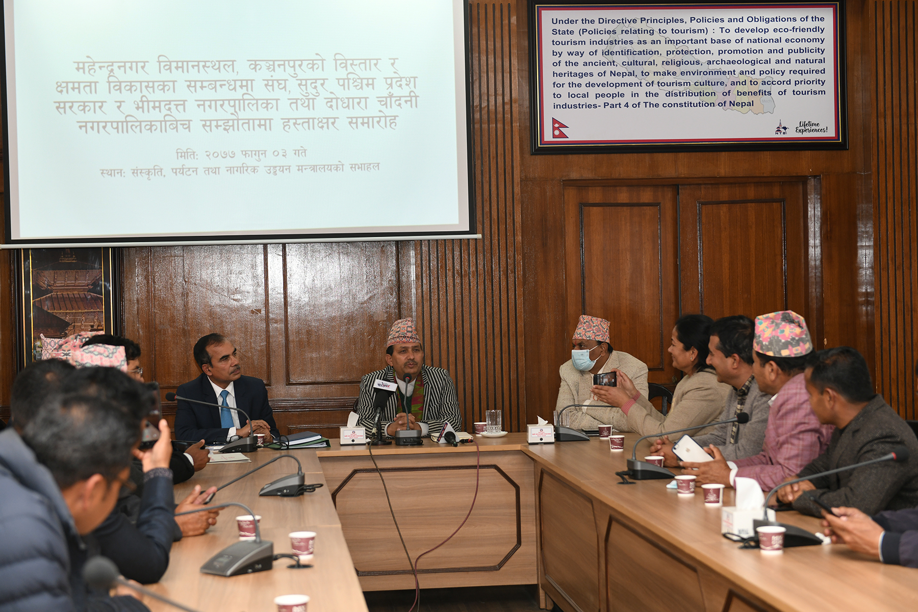 माननीय संस्कृति, पर्यटन तथा नागरिक उड्डयन मन्त्रीज्यूको समुपस्थितिमा महेन्द्रनगर विमानस्थल, कञ्चनपुरको विस्तार र क्षमता विकासका सम्बन्धमा संघ, सुदुर पश्चिम प्रदेश र भीमदत्त नगरपालिका तथा दोधारा चाँदनी नगरपालिकाबिच सम्झौतामा हस्ताक्षर समारोहका तस्वीरहरु- (