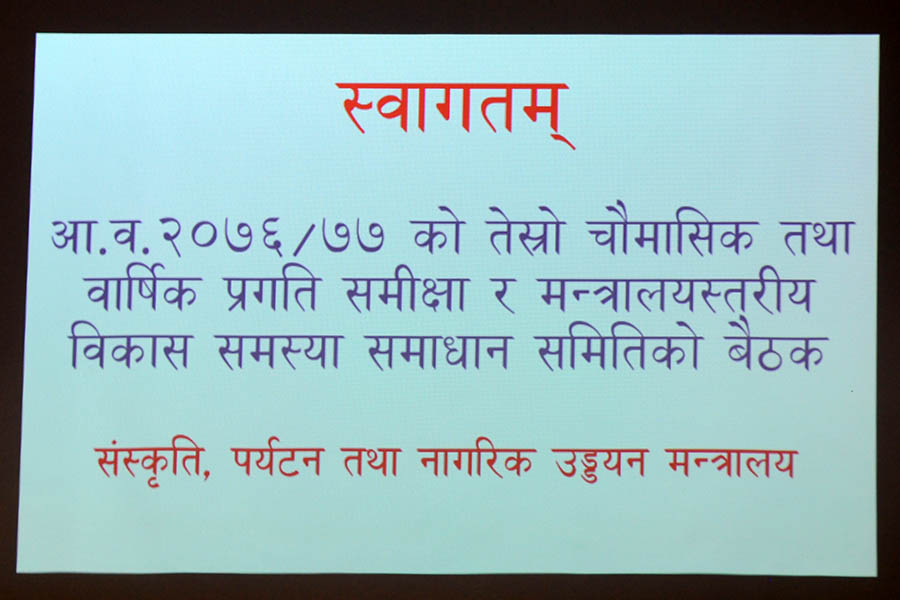 माननीय मन्त्रीज्यूको समुपस्थितिमा भएको आ.व. २०७६-७७ को बार्षिक प्रगति समीक्षा तथा मन्त्रालयस्तरीय समस्या समाधान समिति(MDAC) को बैठकका -तस्वीरहरु (२०७७-०४-१६)
