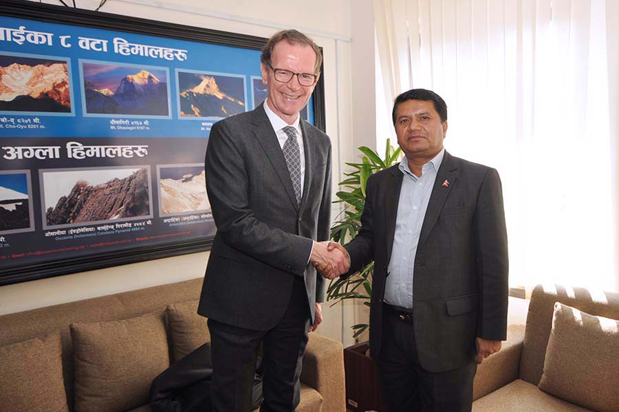 माननीय मन्त्री श्री रविन्द्र अधिकारीसँग जर्मनीका राजदूत H.E. Mr. Roland Schafer को शिष्टाचार भेट-तस्वीर (२०७५-०८-०४)