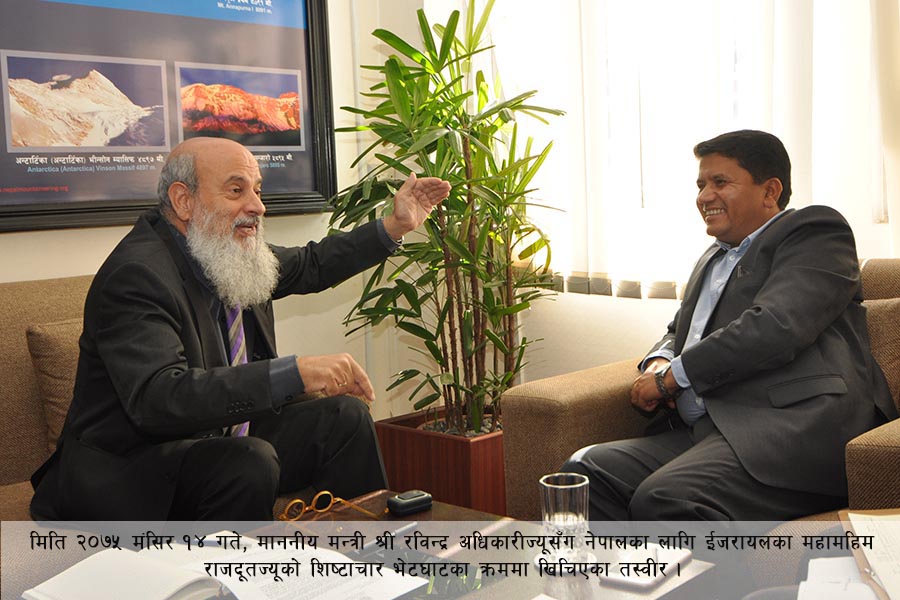 माननीय मन्त्री श्री रविन्द्र अधिकारीसँग क्रमशः फ्रान्स र र्इजरायलका महामहिम राजदूतहरुको शिष्टाचार भेट-तस्वीर (२०७५-०८-१४)