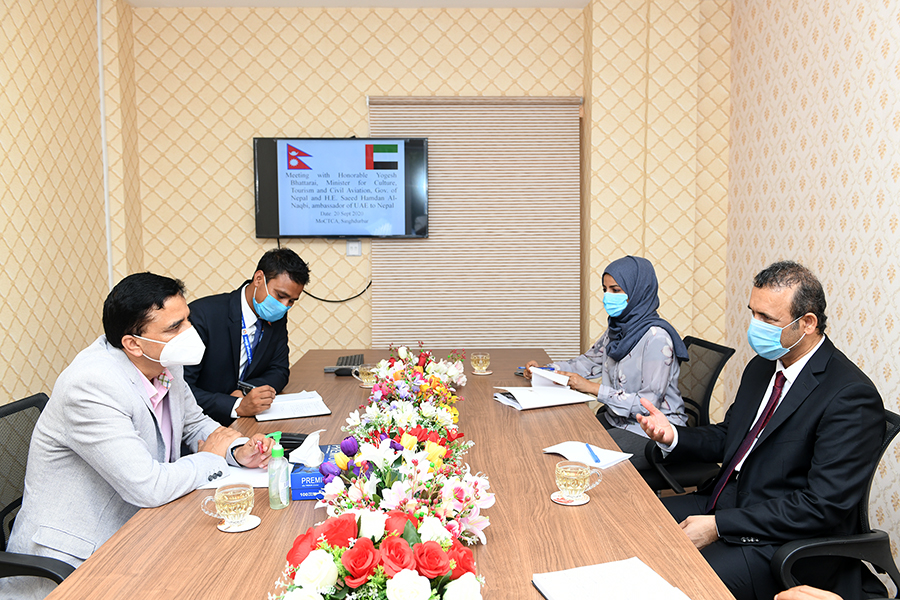माननीय मन्त्रीज्यूसँग नेपालका लागि UAE का महामहिम राजदूत Mr. Saeed Hamdan Al- Naqbi को शिष्टाचार भेटको तस्वीर (२०७७-६-४)