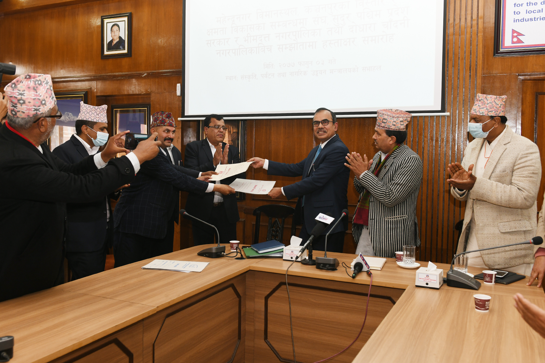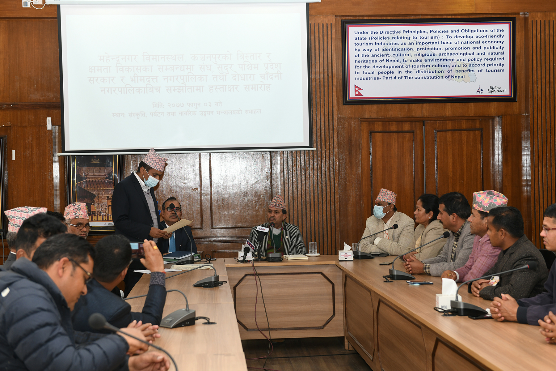 माननीय संस्कृति, पर्यटन तथा नागरिक उड्डयन मन्त्रीज्यूको समुपस्थितिमा महेन्द्रनगर विमानस्थल, कञ्चनपुरको विस्तार र क्षमता विकासका सम्बन्धमा संघ, सुदुर पश्चिम प्रदेश र भीमदत्त नगरपालिका तथा दोधारा चाँदनी नगरपालिकाबिच सम्झौतामा हस्ताक्षर समारोहका तस्वीरहरु- (