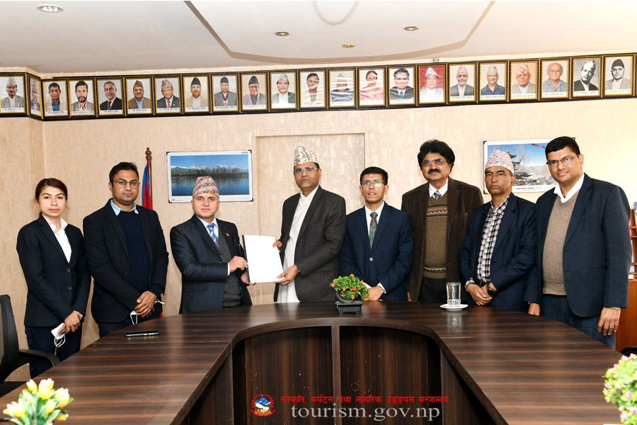 गैर सैनिक हवार्इ उडान (दुर्घटना जाँच) नियमावली २०७८ को मस्यौदा कार्यदलका संयोजक श्री बुद्धिसागर लामिछानेबाट श्रीमान सचिवज्यू महेश्वर न्यौपाने समक्ष मस्यौदा पेश भएको कार्यक्रमका तस्वीरहरु (२०७८-११-०९)