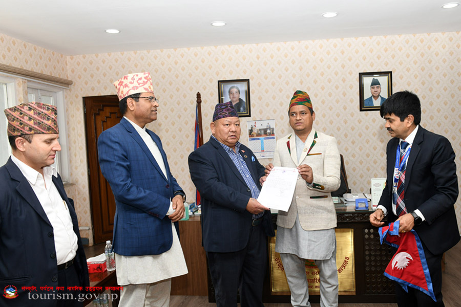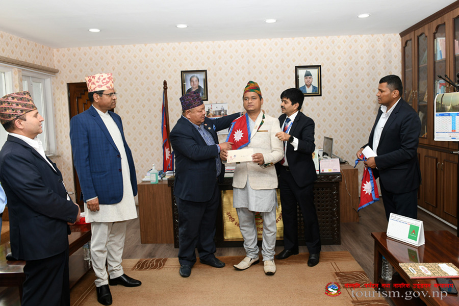संस्कृति, पर्यटन तथा नागरिक उड्डयन मन्त्री माननीय प्रेम बहादुर आलेज्यूबाट फरक क्षमता भएका(दृष्टिबिहीन) नेपाली नागरिक अमिट के.सी.(चित्र बहादुर के.सी.) लार्इ सगरमाथाको सफल आरोहणको शुभकामना सहित नेपाल सरकारको तर्फबाट आर्थिक सहयोग हस्तान्तरण कार्यक्रमका तस्व