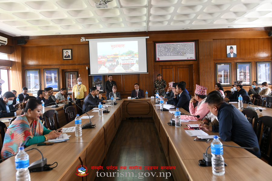 संस्कृति, पर्यटन तथा नागरिक उड्डयन मन्त्रालयको आयोजनामा पर्यटन क्षेत्रको पुनरुत्थान कार्ययोजना-२०७९ सम्बन्धमा काठमाडौं उपत्यका महानगर/ नगरपालिकाहरुसँग भएको छलफल कार्यक्रमका तस्वीरहरु-(२०७९-०४-२०)