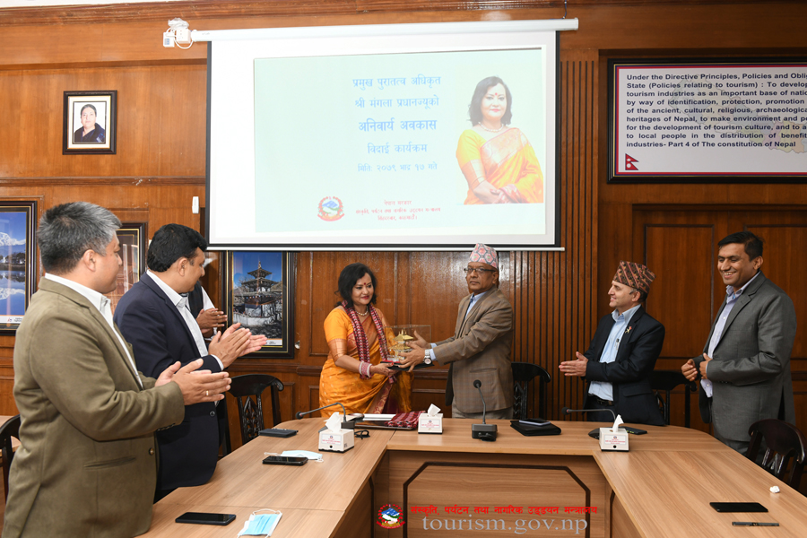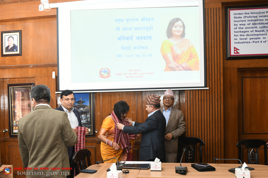 संस्कृति, पर्यटन तथा नागरिक उड्डयन मन्त्रालयका प्रमुख पुरातत्व अधिकृत श्री मंगला प्रधानज्यूको विदार्इ कार्यक्रमका तस्वीरहरु(२०७९-०५-१७)