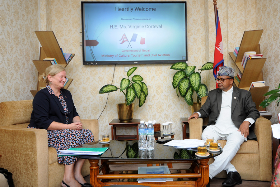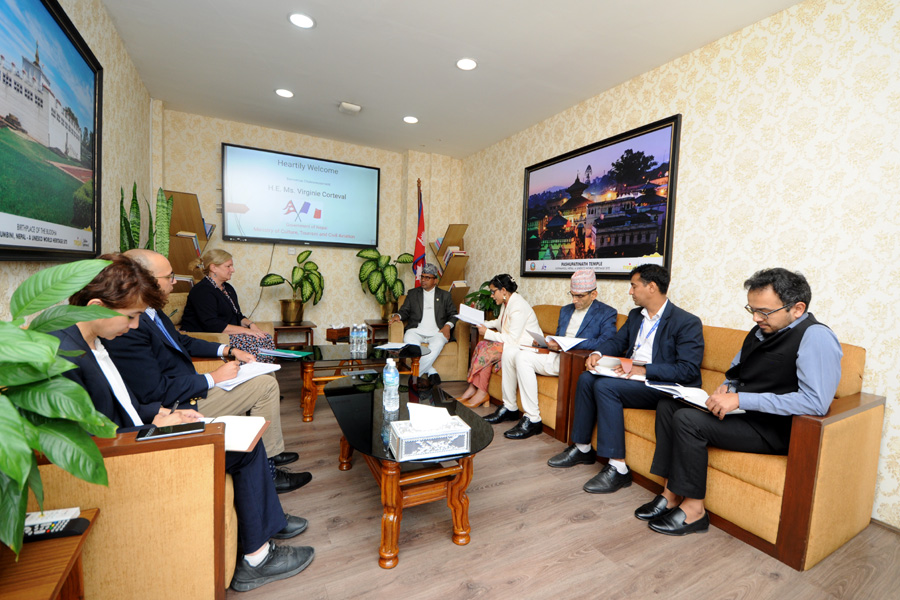 सस्कृति, पर्यटन तथा नागरिक उड्डयन मन्त्री माननीय बद्री प्रसाद पाण्डेसँग नेपालका लागि फ्रान्सका महामहिम राजदूत H.E. Ms.Virginie Corteval को शिष्टाचार भेटका तस्वीरहरु (२०८१-०७-०७)