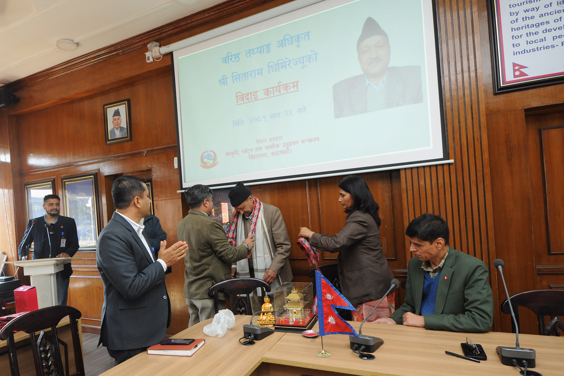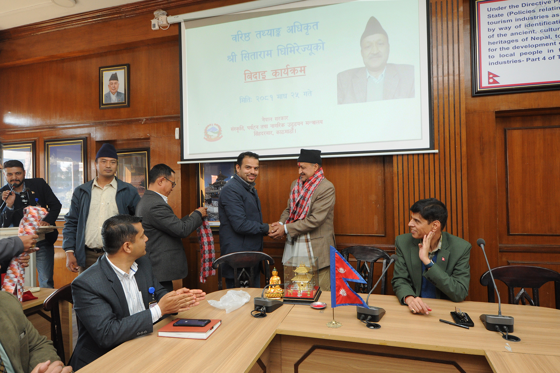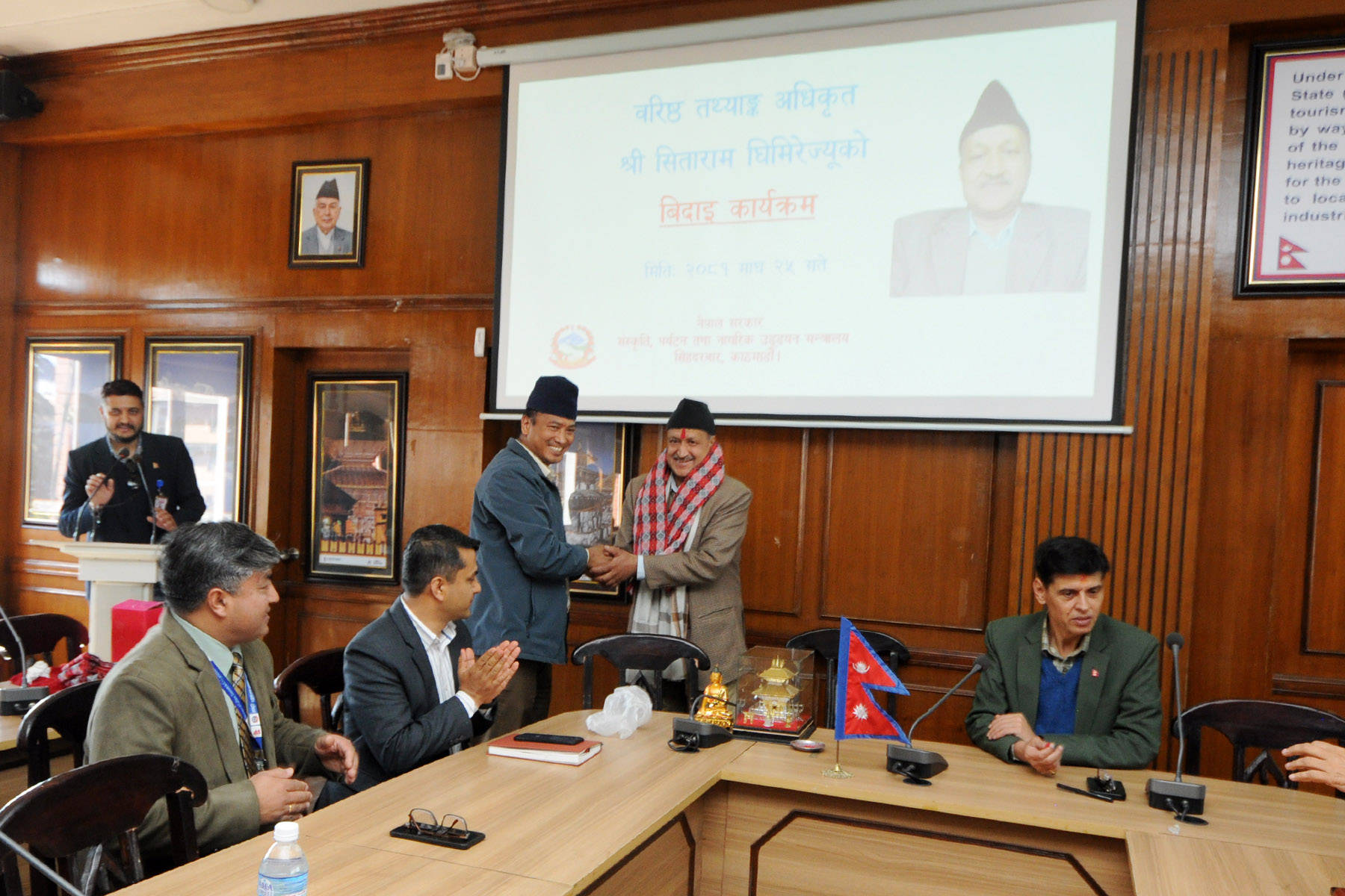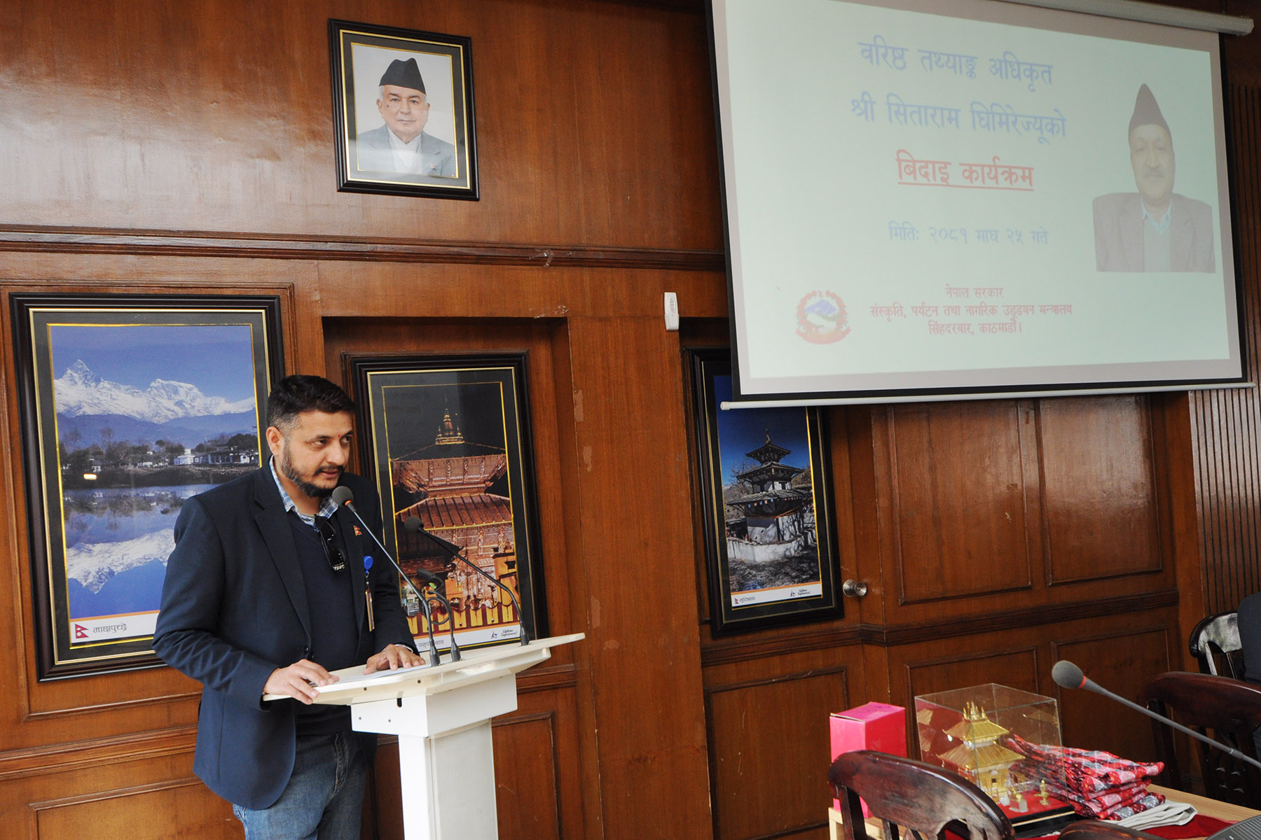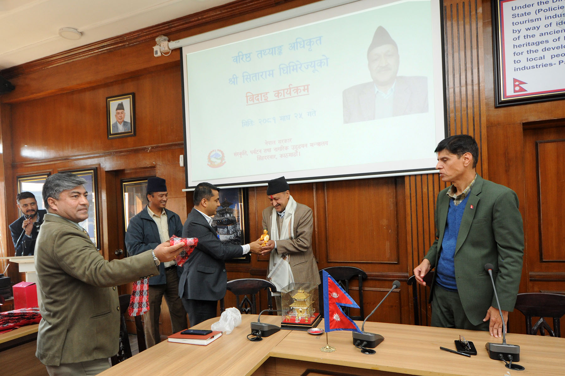 श्रीमान सचिव श्री बिनोद प्रकार सिंहज्यूबाट मन्त्रालयको सभाकक्षमा सेवा निवृत्त वरिष्ठ तथ्याङ्क अधिकृत श्री सिताराम घिमिरेज्यूको बिदाई कार्यक्रमका तस्वीरहरु(२०८१-१०-२५)