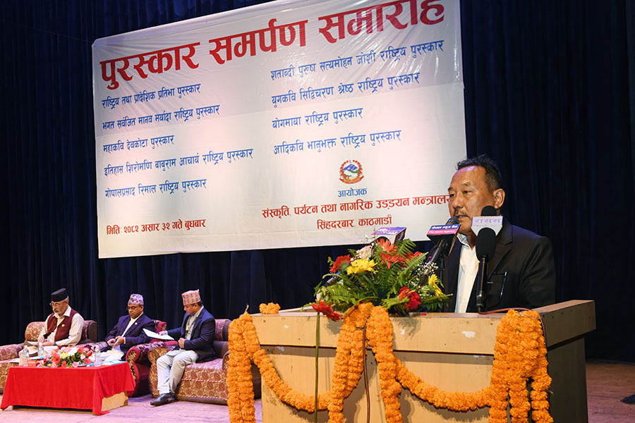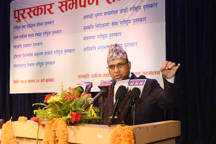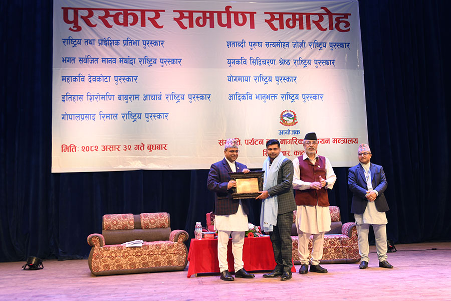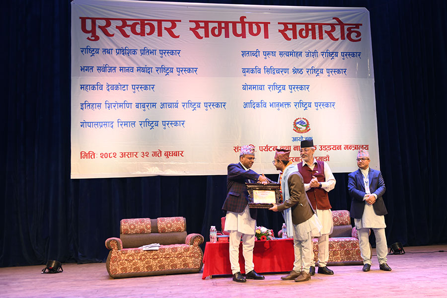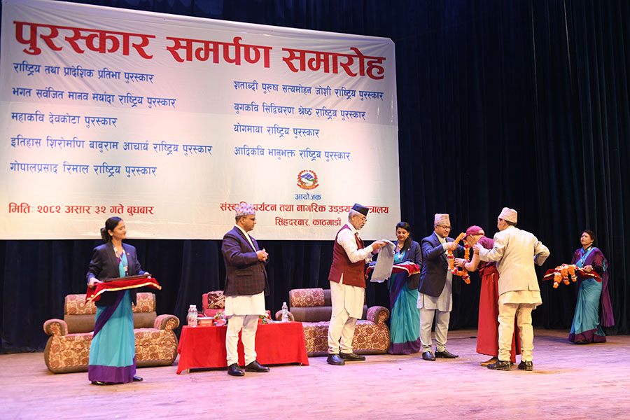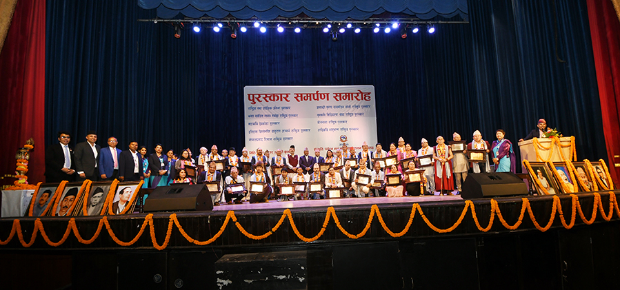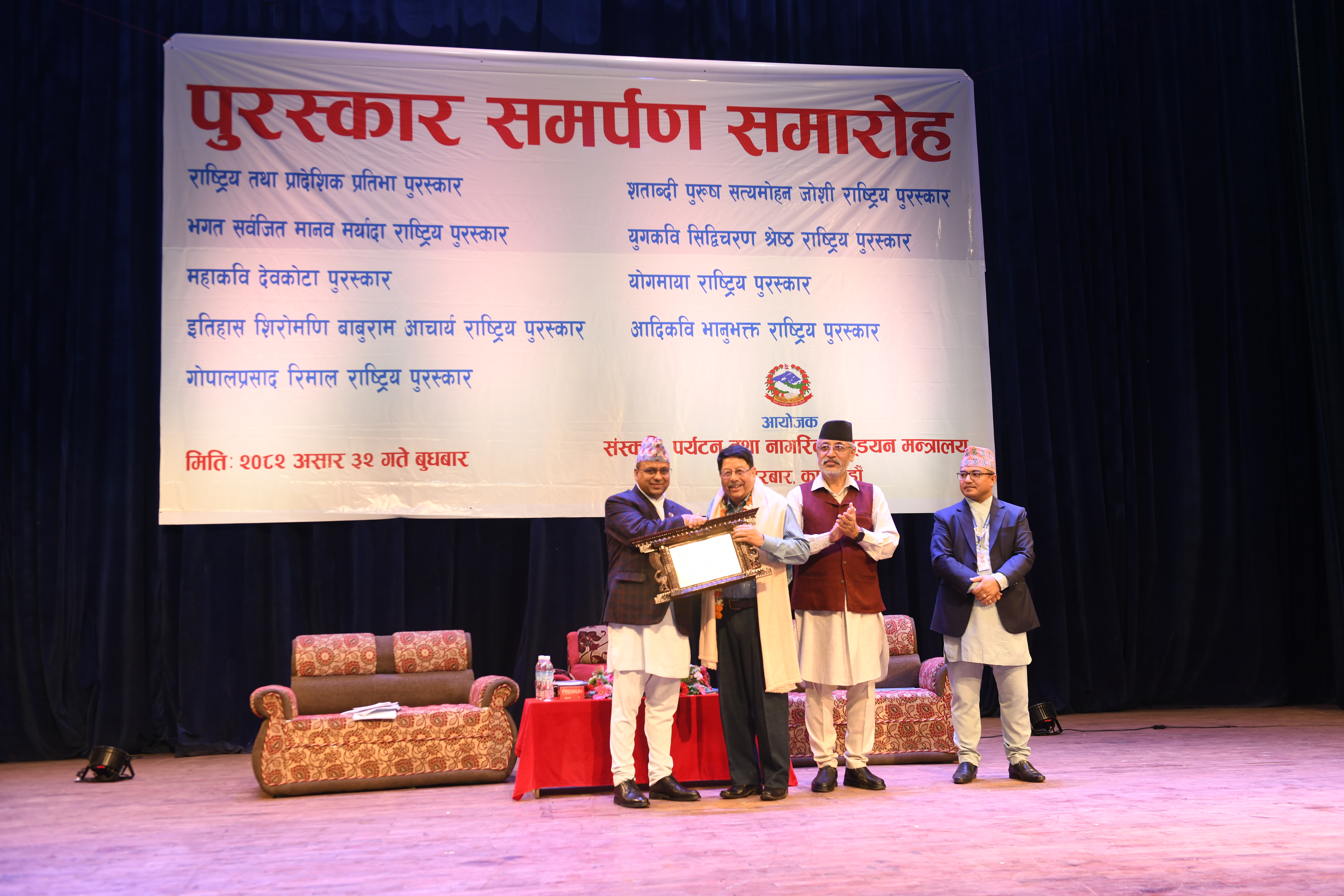 नेपाल सरकार संस्कृति, पर्यटन तथा नागरिक उड्डयन मन्त्रालयबाट माननी मन्त्री श्री बद्री प्रसाद पाण्डेज्यूको प्रमुख आतिथ्यमा सम्पन्न २०८१ सालको विभिन्न विधामा पुरस्कार समर्पण समारोहका तस्वीरहरु(२०८२।०३।३२)
