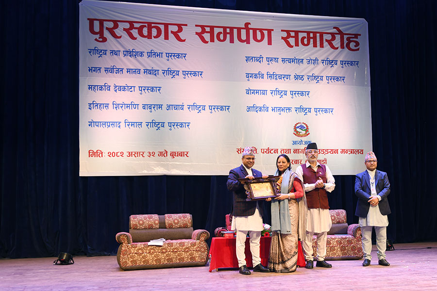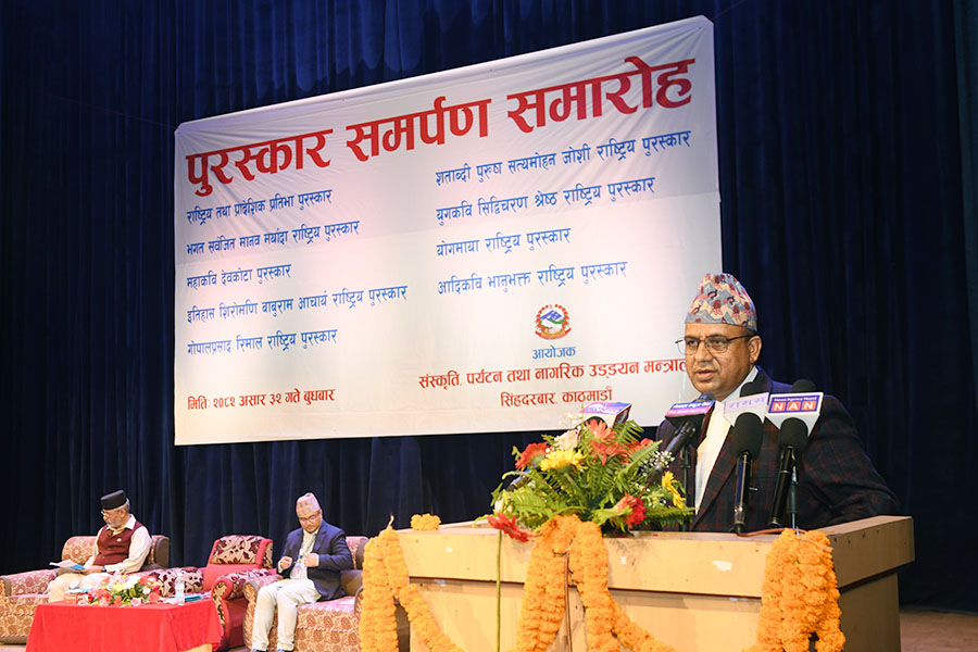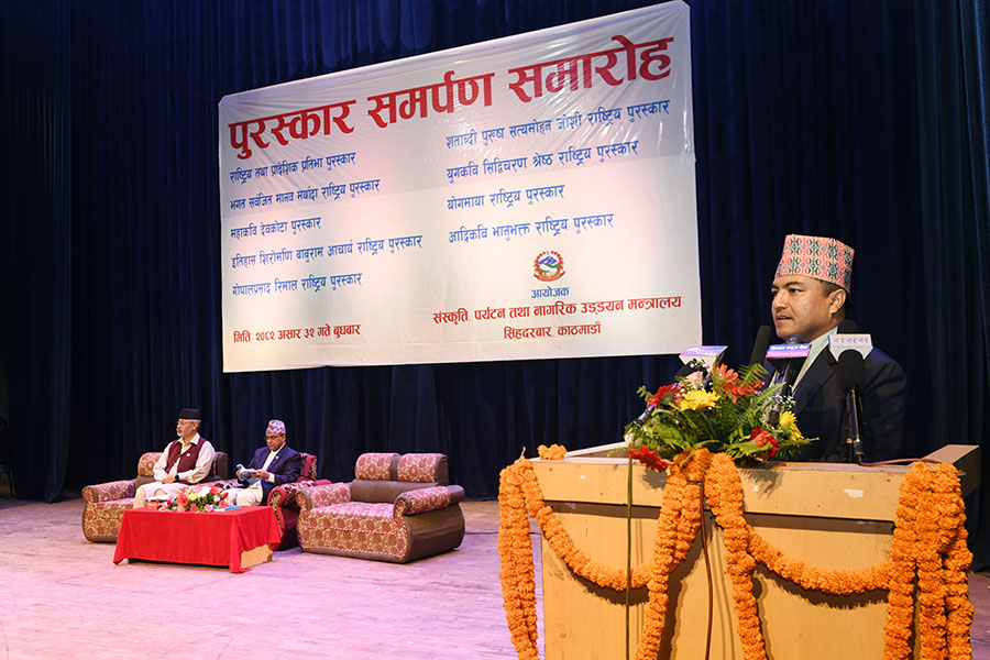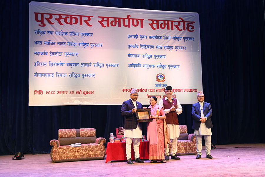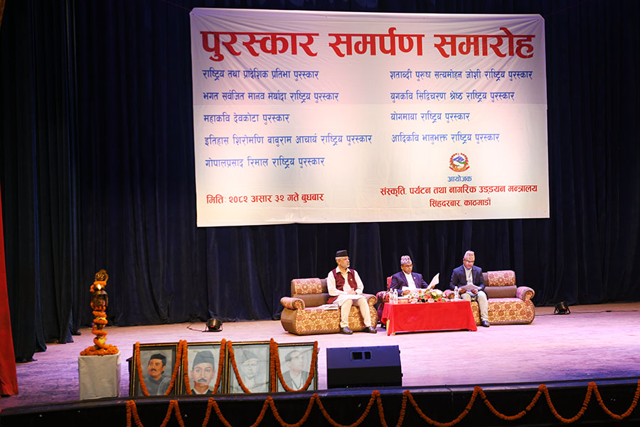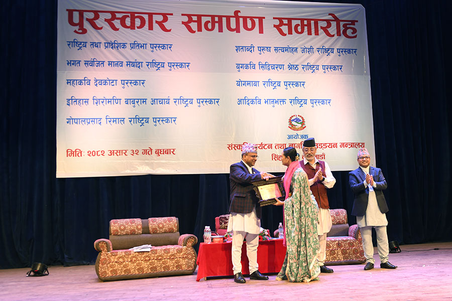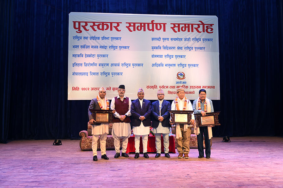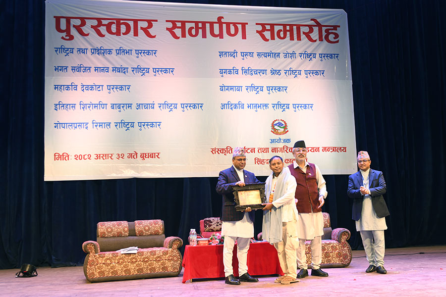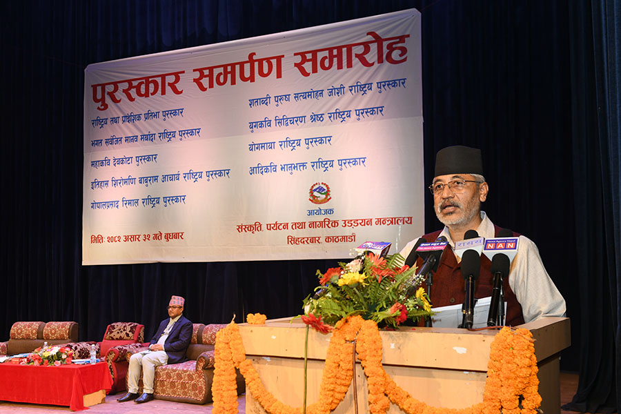 नेपाल सरकार संस्कृति, पर्यटन तथा नागरिक उड्डयन मन्त्रालयबाट माननी मन्त्री श्री बद्री प्रसाद पाण्डेज्यूको प्रमुख आतिथ्यमा सम्पन्न २०८१ सालको विभिन्न विधामा पुरस्कार समर्पण समारोहका तस्वीरहरु(२०८२।०३।३२)