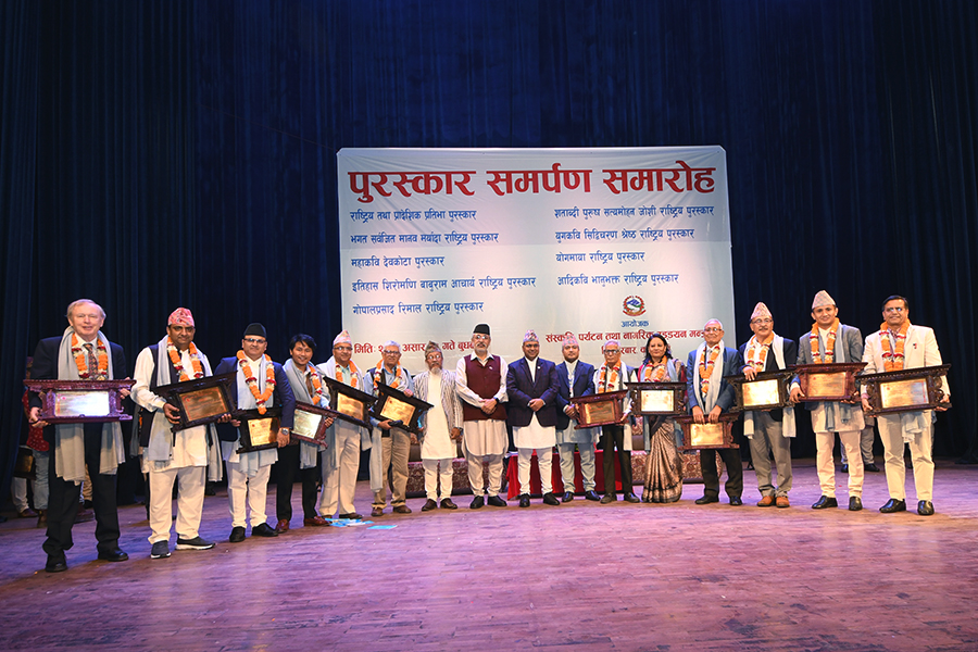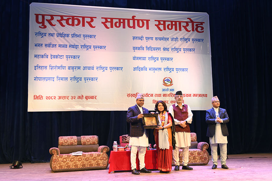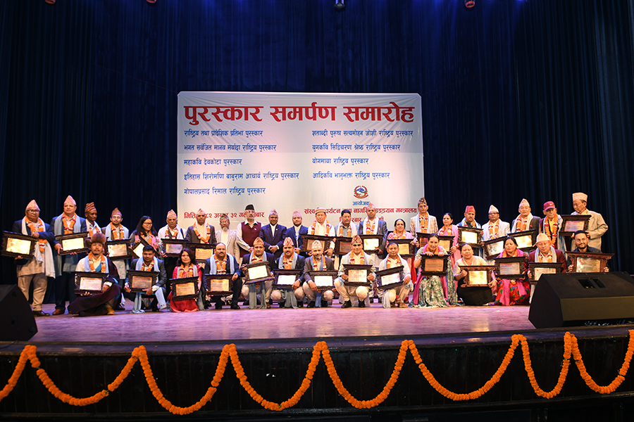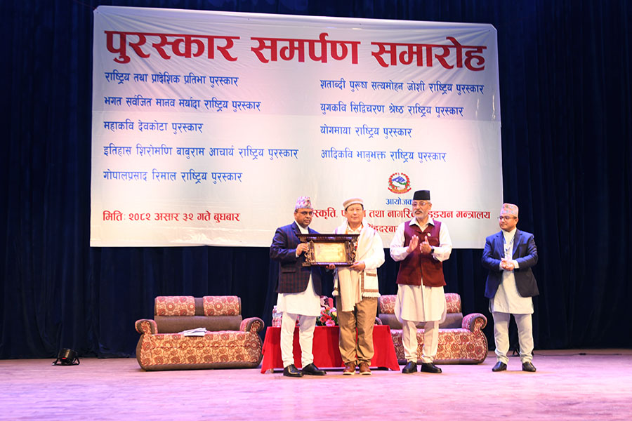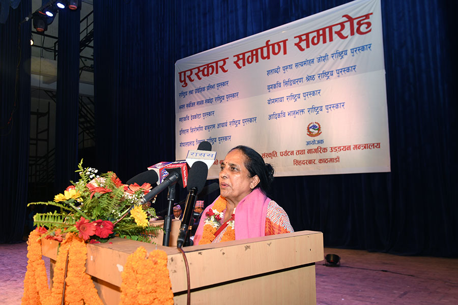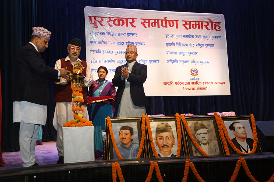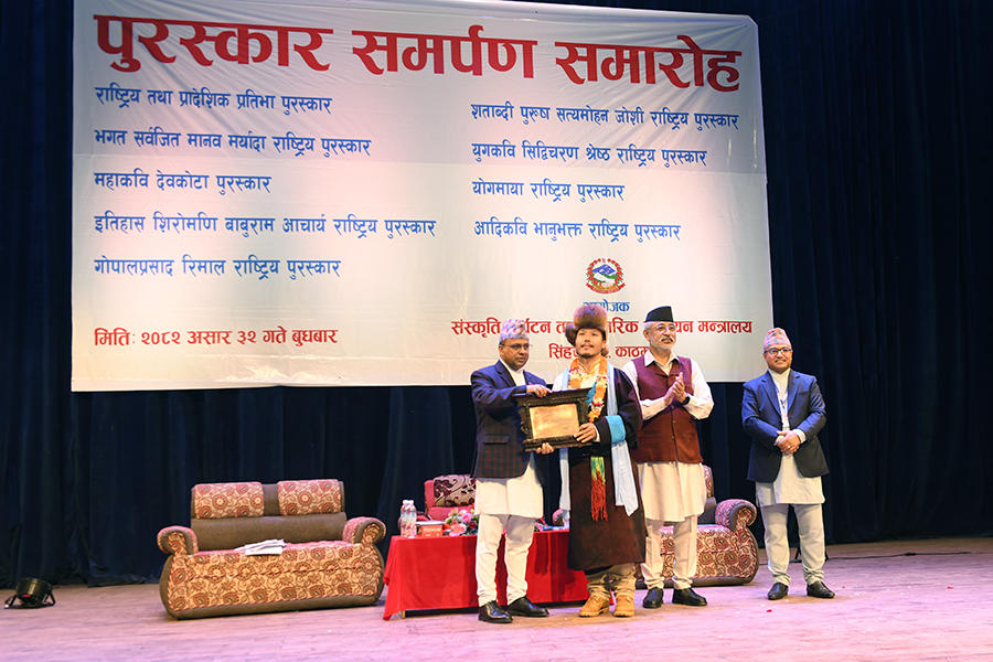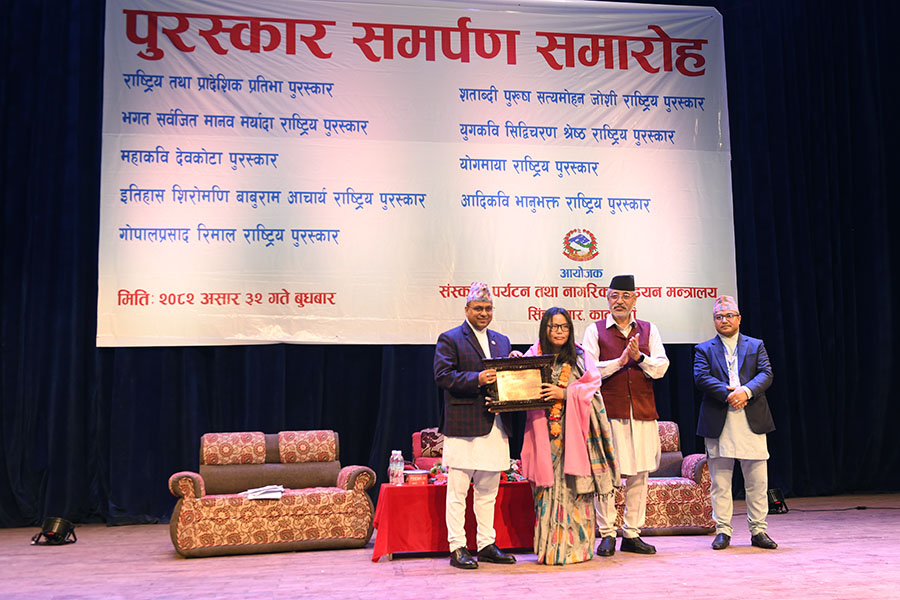 नेपाल सरकार संस्कृति, पर्यटन तथा नागरिक उड्डयन मन्त्रालयबाट माननी मन्त्री श्री बद्री प्रसाद पाण्डेज्यूको प्रमुख आतिथ्यमा सम्पन्न २०८१ सालको विभिन्न विधामा पुरस्कार समर्पण समारोहका तस्वीरहरु(२०८२।०३।३२)
