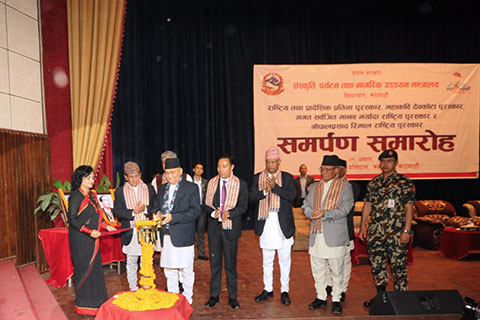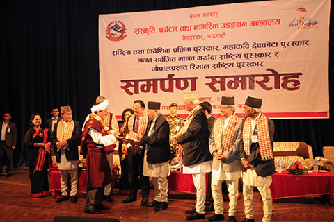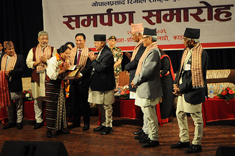 बि.सं. २०७५ सालको राष्ट्रिय तथा प्रादेशिक प्रतिभा पुरस्कार, महाकवि देवकोटा पुरस्कार, भगत सर्वजित मानव मर्यादा राष्ट्रिय पुरस्कार र गोपालप्रसाद रिमाल राष्ट्रिय पुरस्कार समर्पण समारोहको तस्वीर (२०७६-०३-२९)
