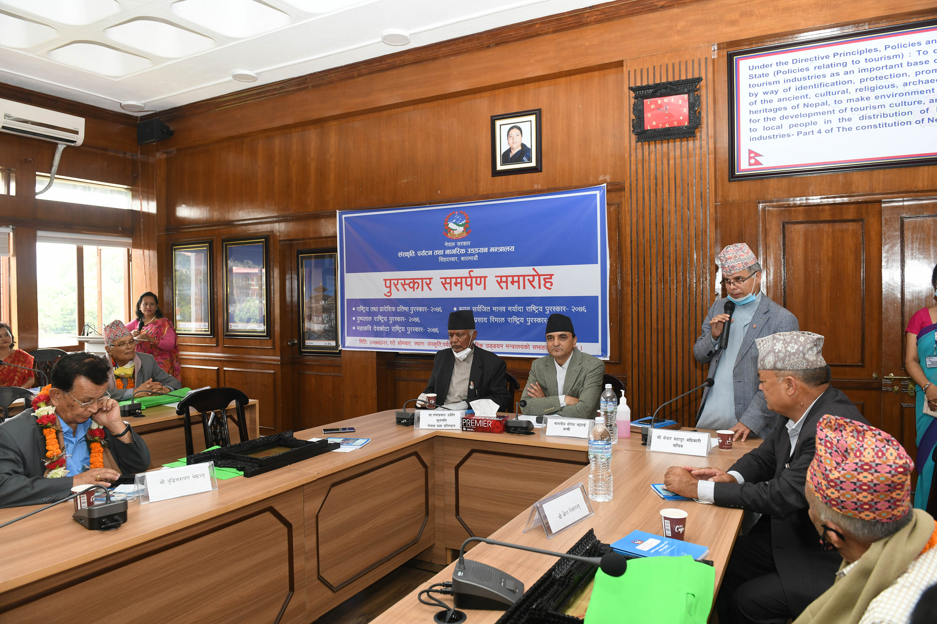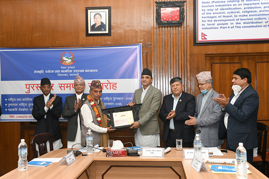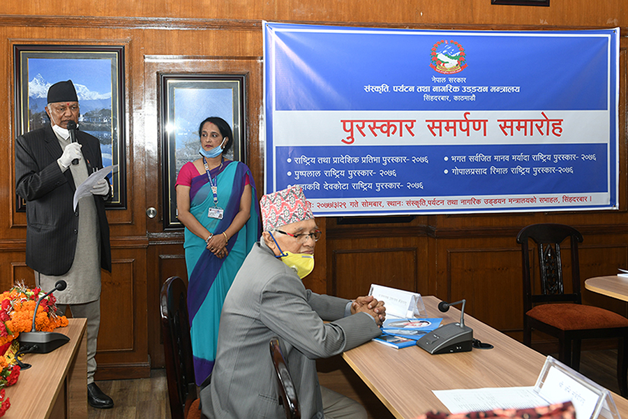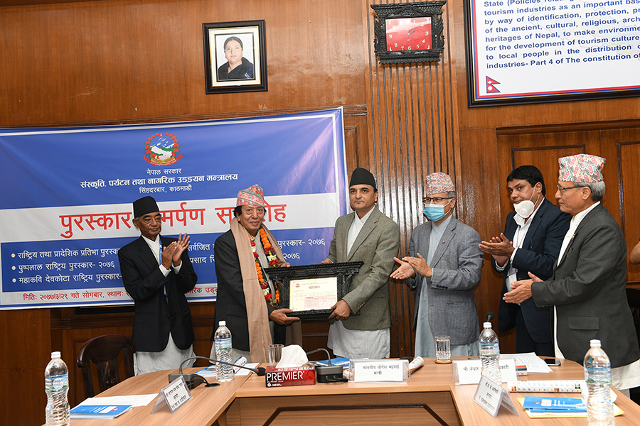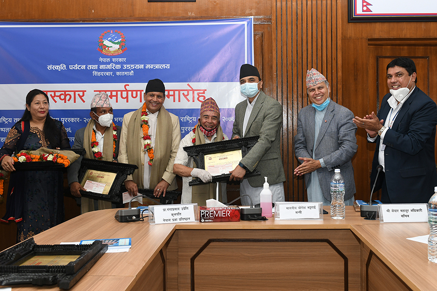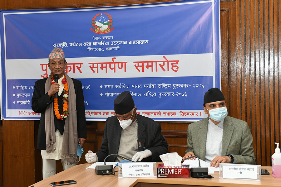 माननीय मन्त्री श्री योगेश भट्टरार्इज्यूबाट एक समारोहका बीच विभिन्न विधामा क्रमशः राष्ट्रिय तथा प्रादेशिक प्रतिभा, महाकवि देवकोटा, पुष्पलाल राष्ट्रिय, भगत सर्वजित मानव मर्यादा राष्ट्रिय र गोपालप्रसाद रिमाल राष्ट्रिय पुरस्कार २०७६ समर्पण गर्नुभयो। तस्वीर-