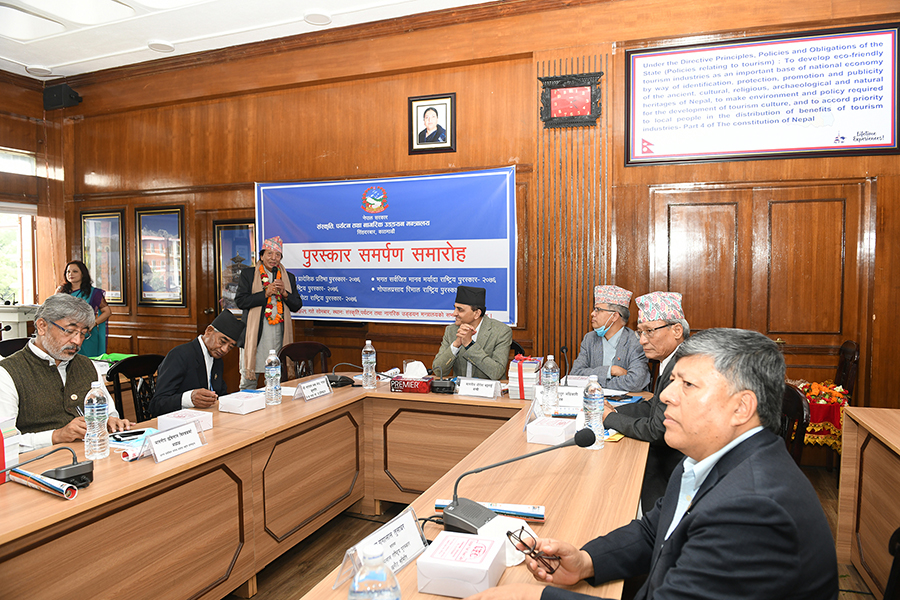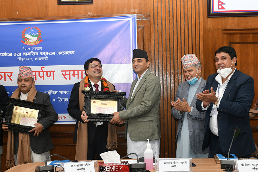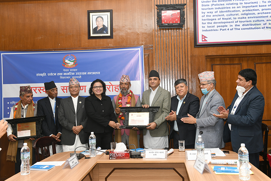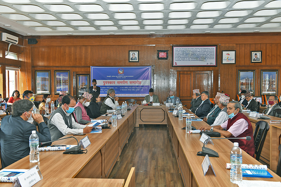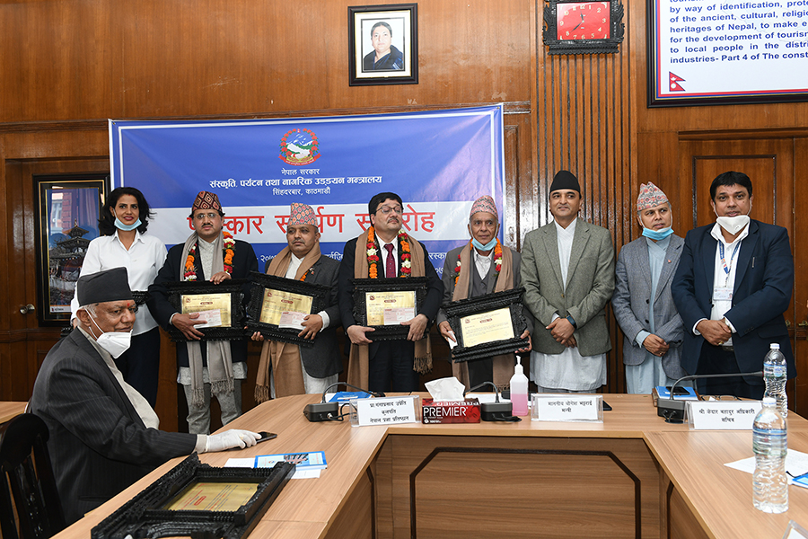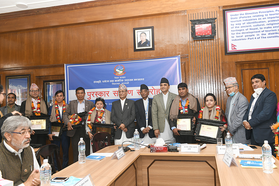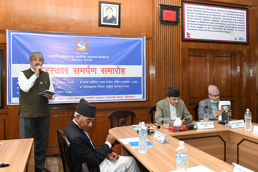 माननीय मन्त्री श्री योगेश भट्टरार्इज्यूबाट एक समारोहका बीच विभिन्न विधामा क्रमशः राष्ट्रिय तथा प्रादेशिक प्रतिभा, महाकवि देवकोटा, पुष्पलाल राष्ट्रिय, भगत सर्वजित मानव मर्यादा राष्ट्रिय र गोपालप्रसाद रिमाल राष्ट्रिय पुरस्कार २०७६ समर्पण गर्नुभयो। तस्वीर-