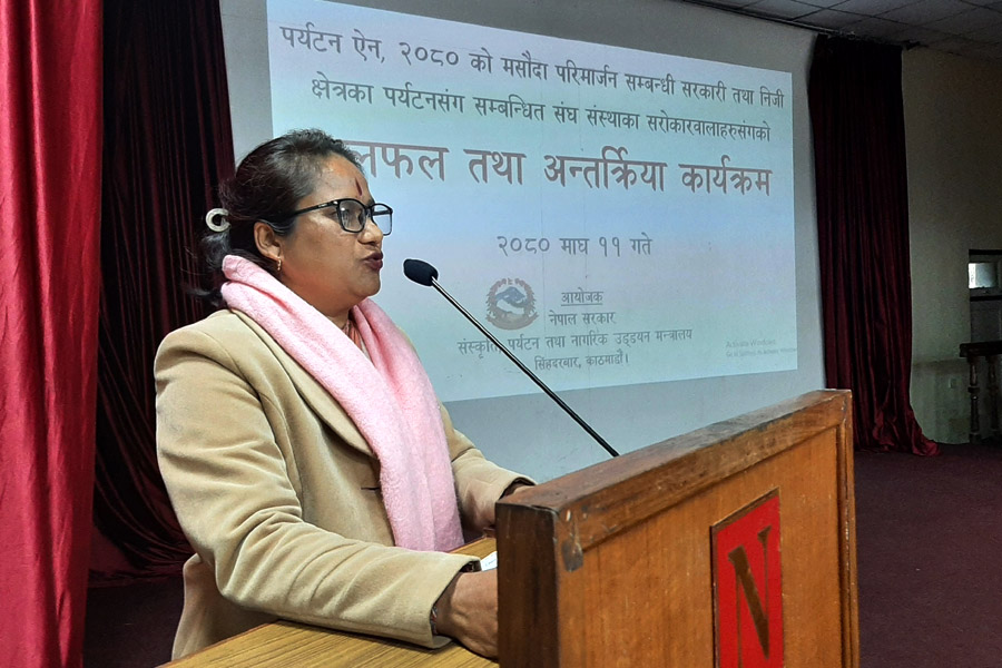 पर्यटन ऐन, २०८० को मस्यौदा परिमार्जन सम्बन्धी सरकारी तथा निजी क्षेत्रका पर्यटनसंग सम्बन्धित संघ संस्ठाका सरोकारवालाहरुसंगको छलफल तथा अन्तरक्रिया कार्यक्रमका तस्वीरहरु(२०८०-१०-११)