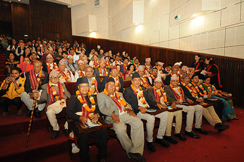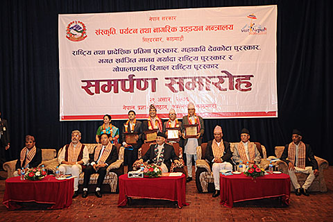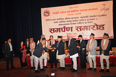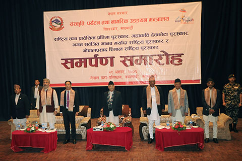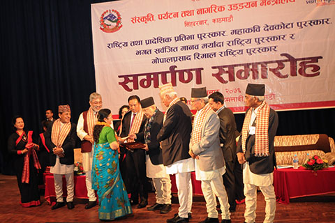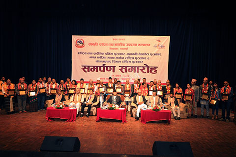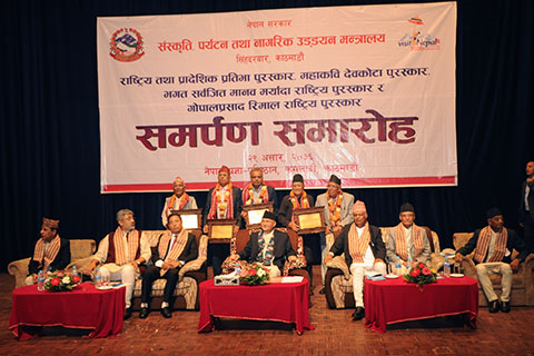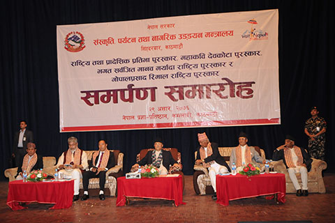 बि.सं. २०७५ सालको राष्ट्रिय तथा प्रादेशिक प्रतिभा पुरस्कार, महाकवि देवकोटा पुरस्कार, भगत सर्वजित मानव मर्यादा राष्ट्रिय पुरस्कार र गोपालप्रसाद रिमाल राष्ट्रिय पुरस्कार समर्पण समारोहको तस्वीर (२०७६-०३-२९)