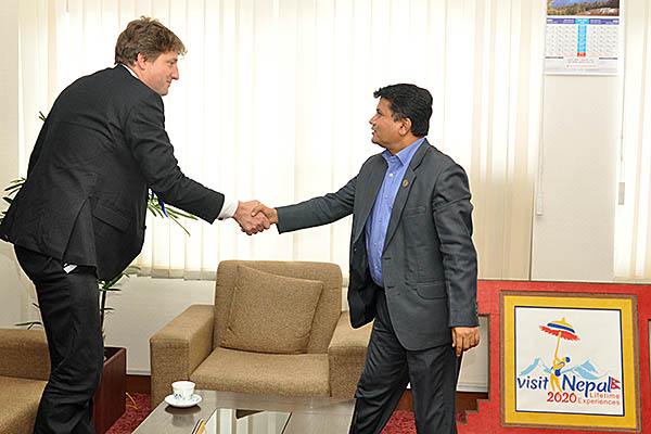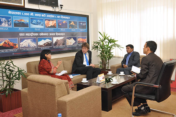 माननीय मन्त्री श्री रविन्द्र अधिकारीसँग DFID का प्रमुख Dr. Rurik Marsden को शिष्टाचार भेट